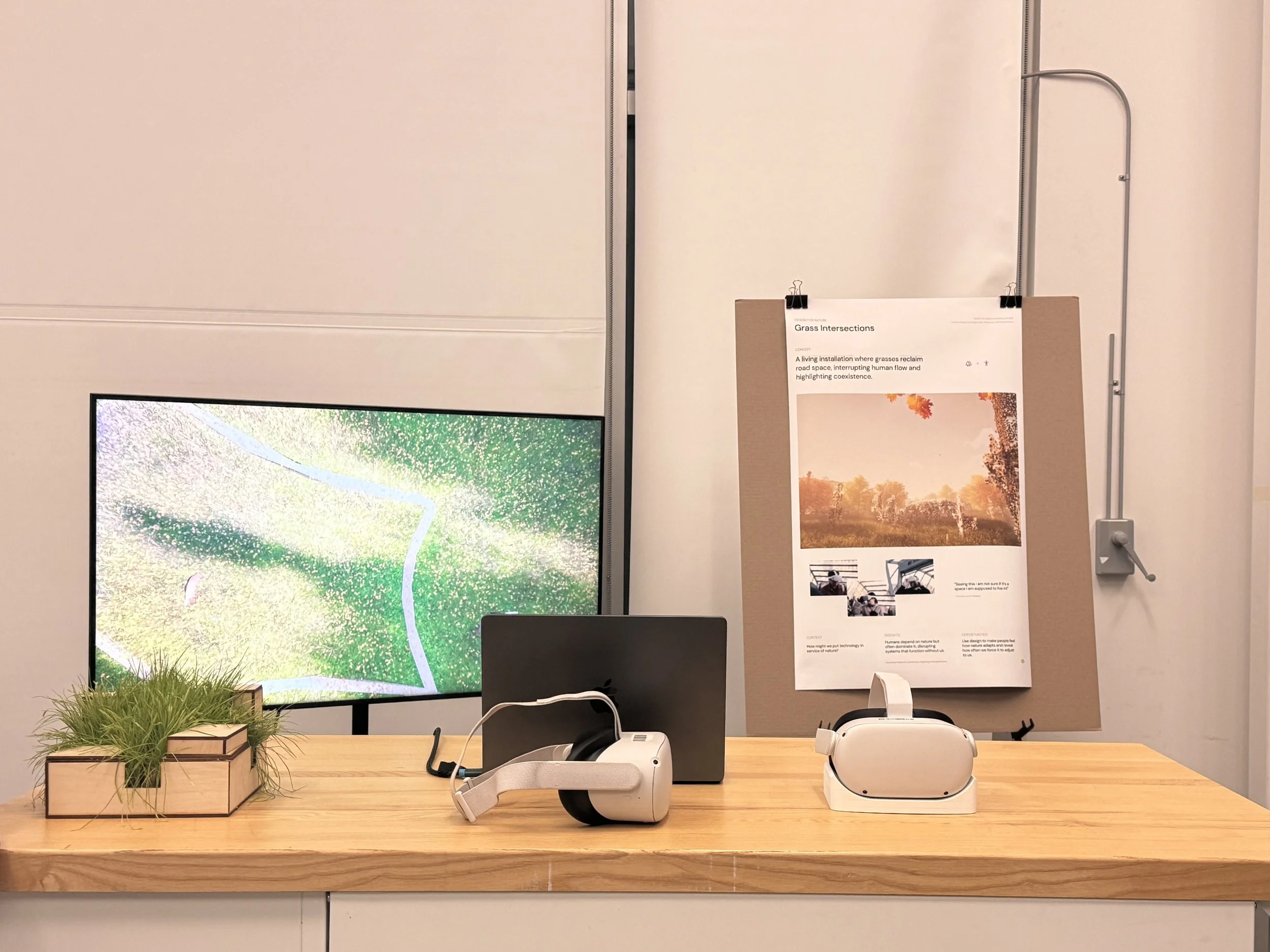 Prototype Complete Set Line-up: Promo Video, Poster, Tactile Touch-Grass Urban Model, VR Headsets.